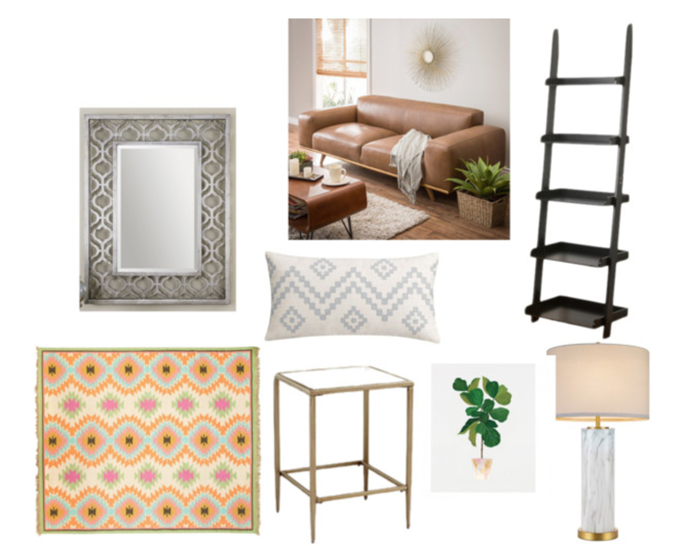 Shop the post: mirror | side table | table lamp | accent pillows | plant print | rug | bookcase | couch